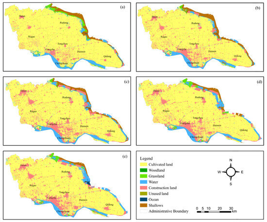 Land use spatial distribution in Nantong: (a) 2005; (b) 2010; (c) 2015; (d) 2018; (e) 2020.