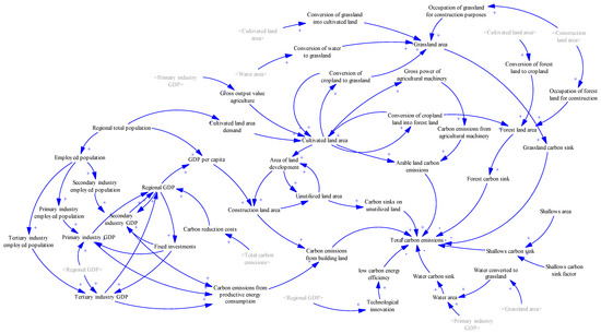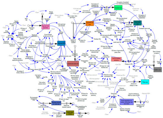 System dynamics (SD), proposed by Forrester, has significant advantages in understanding non-linear, multivariate, and dynamic carbon emission processes [24]. The method has been implemented extensively in the prediction of regional low-carbon economic development models and the prediction of land resource demand under low-carbon requirements. Zeng et al. [25] developed an SD model for reductions in carbon emissions and pollution, and investigated the effects of different policy combinations on regional pollution reduction and carbon reduction in four scenarios. Wang et al. [26] utilized the published scenes for climate change of CMIP6, coupled with the SD model, and the PLUS model to simulate the land use and carbon stock changes in Bortala. Tang et al. [27] used a combination of shared socio-economic pathways and representationally concentrated pathways for three future scenarios, the SD model, and the PLUS model to simulate the land use patterns. However, at present, the application of the SD model in the simulation of municipal land use carbon emissions is still relatively limited.