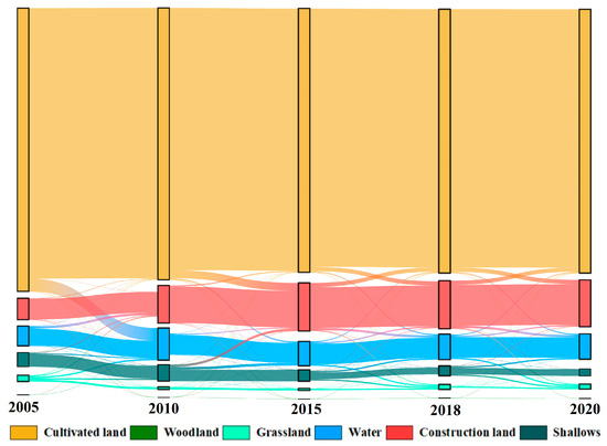 Sankey map of land use transfers from 2005 to 2020.