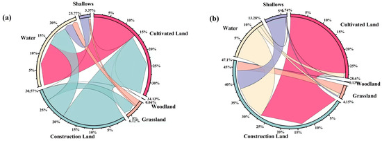 According to the land use images of Nantong from 2005 to 2020 (Figure 3), land use transfers over the four periods of 2005–2010, 2010–2015, 2015–2018, and 2018–2020 were obtained by using ArcGIS 10.3 software and OriginPro 2024 software (Figure 6), respectively, and this paper concentrates on changes in area and the magnitude of changes of six land use types, excluding the unutilized land due to its negligible area.