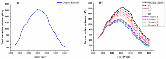 Projections of net carbon emissions: (a) original scenario; (b) policy combination scenarios.
