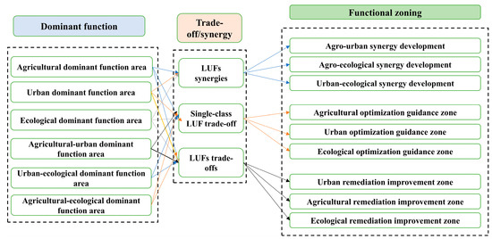 On the basis of the above partition scheme, the result of space partition is finally determined according to the trade-offs/synergy relationship. Firstly, the trade-offs/synergies of LUF changes are divided into three types: no trade-offs between LUF changes, single-class trade-off of LUF changes, and multifunctional trade-offs. Among them, there is no trade-off relationship between LUF changes, indicating that there is a cooperative relationship or an unrelated relationship between LUFs. The single type of trade-off of LUF variation means that there are trade-offs between the dominant function of territorial space and other functions. The multifunctional trade-offs indicate that there are trade-offs between all LUF changes. Secondly, the layer with trade-offs/synergies of LUF changes was spatially overlaid with the dominant functional zoning layer to obtain the final functional zoning results (Figure 2). Specifically, synergistic development zones were designated for dominant functional areas without any trade-off relationships; optimization and guidance zones were assigned to dominant functional areas with a single type of trade-off relationship; and restoration and improvement zones were allocated to dominant functional areas with multifunctional trade-offs.