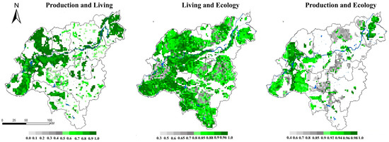 Temporal dimension: Overall, there was a trade-off between the production–living–ecology functions in the study area, indicating an increasing prominence of conflicts among them. Specifically, the synergistic relationship observed between the production–living function in 2000 (coefficient = 0.489) had turned into a trade-off relationship in 2020 (coefficient = −0.414), indicating a gradual escalation of their contradiction over time. The trade-off relationship between the living–ecological function had remained constant; however, the trade-off coefficient had decreased from −0.641 in 2000 to −0.591 in 2020, suggesting a slight downward trend in conflict intensity. In addition, the production–ecological function shifted from a trade-off relationship (coefficient = −0.467) in 2000 to a synergistic relationship (coefficient = 0.691) in 2020, showing a clear inclination towards ecological or eco-industrial development. The correlation coefficients between the functional changes from 2000 to 2020 indicated that the intensity of change was highest (coefficient = −0.225) between the production and ecological functions, followed by a moderate intensity of change (coefficient = −0.087) between the production and living functions, while the lowest intensity of change (coefficient = 0.14) was observed between the living and ecological functions, indicating synergistic changes.
