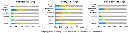(3) In terms of the production–living function, forest exhibited the highest proportion of trade-off area at 20.8%, predominantly characterized by the trade-off (+−) type. Grassland followed with 15.9% of its trade-off area, while arable land showed the largest share of synergistic area with 25.5%, mainly dominated by the synergistic (++) type, closely followed by built-up land with 23.9% of its total area.