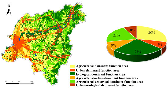 The regions with a single advantage can be divided into agricultural dominant functional area, urban dominant functional area, and ecological dominant functional area. In addition, if there are two different advantages in a region, it can be divided into agricultural–urban dominant functional area, urban–ecological functional area, and agricultural–ecological functional area and there is almost no region with three advantages at the same time.