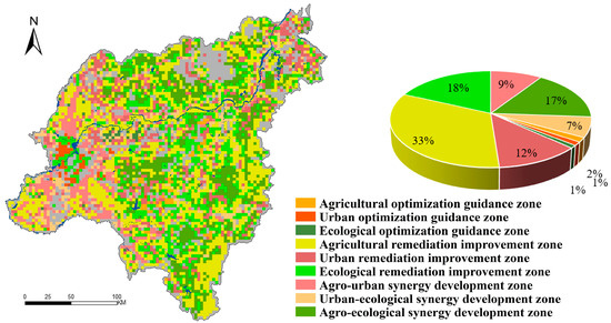 According to the classification rules in Figure 2, a total of nine grid-scale territorial spatial functional zones were classified in the study area, as shown in Figure 8. The gray area in the figure indicates that there is no obvious trade-off/synergy relationship between the land use function values (which has not passed the significance test in MGWR), so it is a null value in the spatial overlay analysis.