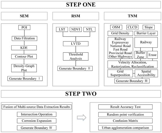 - Wang, G.; Wang, Y.; Li, Y.; Chen, T. Identification of Urban Clusters Based on Multisource Data—An Example of Three Major Urban Agglomerations in China. Land 2023, 12, 1058. [Google Scholar] [CrossRef]