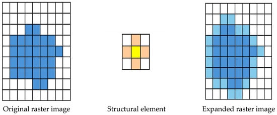 Subsequently, local adjustments and improvements were made using morphological algorithms, mainly including boundary expansion, intersection merging, and the removal of smaller patches. In order to facilitate the connection of closely spaced built-up patches, this study used the dilate algorithm and set a cross shape with structural elements of 3 * 3. The inflation algorithm follows Formula (5), and its main idea is to drag the structural element to move in the image domain X. At each position, when the center point of structural element B is shifted to a point (x, y) on image X, if the pixel of the structural element intersects with at least one pixel of the target object, the (x, y) pixel points are retained to achieve the effect of expanding the boundary outward (Figure 5).