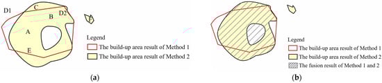 An example of the crossover and merge algorithms is shown in Figure 6. The results of the three methods are combined pairwise, and then intersected and merged with the results of the third method. This algorithm can effectively optimize the structure of built-up areas, retain details, and remove surrounding pseudo-built-up areas.