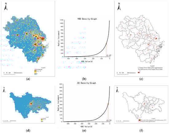 The results of the POIM are presented in Figure 7. The built-up area of YRD is 8012.73 , while the built-up area of CC is 3035.85 . Based on an analysis of the built-up area boundaries of prefecture-level cities in China, a growth rate of 5% has been determined as the allowable value for the Density-Graph curve. As depicted in the figure, YRD reached a critical point when the nuclear density value was 42, whereas CC reached a critical point at a nuclear density value of 24. In YRD, due to a higher concentration of points of interest around Shanghai, the identification results indicate that the built-up area is more connected. Conversely, the built-up areas in CC are mostly scattered.