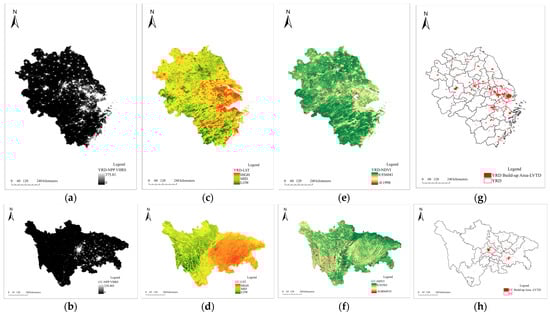 This is a set of figures. (a,b) Description of NPP-VIIRS data of night light index in two urban agglomerations; (c,d) description of LST data of land surface temperature in two urban agglomerations; (e,f) description of NDVI vegetation coverage in two urban agglomerations; (g,h) description of the built-up area results of two urban agglomerations extracted by RSM.