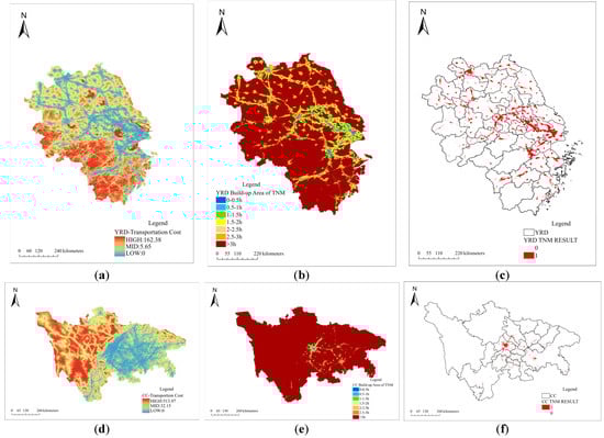 The TRM results are depicted in Figure 9, showing that the built-up area of YRD is 19,353.18 and that of CC is 3903.62 . The transportation road infrastructure in YRD is well developed, providing accessibility to the transportation network, with a median travel time cost of 5.65 h for the entire region. In contrast, the transportation road infrastructure in CC is primarily concentrated in the Chengdu–Chongqing economic circle and it is still undergoing gradual improvements to its transportation network. The median travel time cost for this area is 32.15 h. The extended travel time within the CC can be mainly attributed to the complex landform in western Sichuan province.
