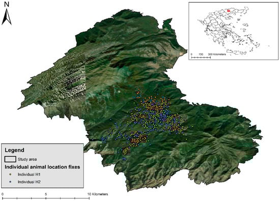 Between September and October 2020, two randomly selected mares (identified as H1 and H2, respectively) were captured using a baited corral trap. Handling was performed by ungulate experts, under the supervision of a veterinarian who was there to ensure the animal’s safety and welfare at all times. Once they were fitted with Lotek Wireless Litetrack Iridium TL-500 GPS collars (Lotek Wireless Inc, Newmarket ON, Canada), both mares were immediately released back into the wild. The collars were programmed to record GPS locations at 1 h intervals for a duration of two years following deployment. Each collar included 2-way communication, allowing a daily download of horse locations. The collars recorded the date, time, location (latitude and longitude), elevation, ambient temperature, type of fix status, and dilution of precision (DOP). In addition, the collars were furnished with a remote drop-off mechanism, which allowed collar removal without recapture and ensured the welfare of the animals after the completion of the study []. Mares were chosen over stallions as they are more likely to remain within the same harem in relation to the latter []. Prior to any analyses, location fixes with DOP values of > 5 were considered inaccurate and were therefore removed [,]. All procedures carried out in this study were conducted in accordance with the Greek animal welfare legislation and conducted under the authority of the project (BIO—INNOVATE/5047319).