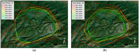 Map depicting the home range size of (a) individual H1 and (b) individual H2, based on the Minimum Convex Polygon (MCP) methodology. Home ranges are illustrated in increments of 5%, ranging from 65% to 95%.