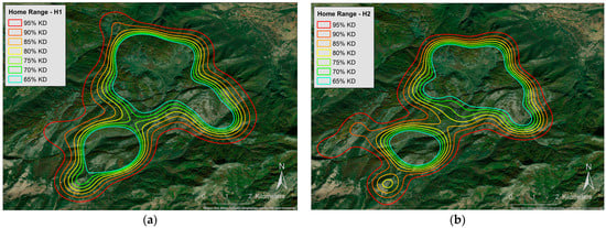 Map depicting the home range size of (a) individual H1 and (b) individual H2, based on the Kernel Density (KD) methodology. Home ranges are illustrated in increments of 5%, ranging from 65% to 95%.