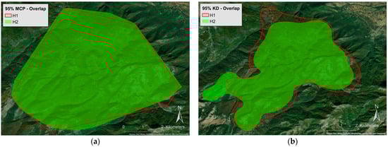 Map depicting the overlap between individual H1’s and H2’s home range size, calculated from (a) the 95% Minimum Convex Polygon (MCP) and (b) the 95% Kernel Density (KD) methods.