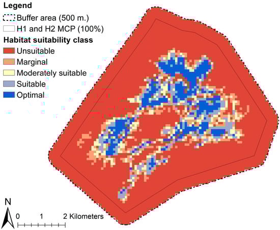 A habitat suitability map was generated using the Mahalanobis distance (D2) statistic []. The Mahalanobis distance statistic measures the contrast between the average habitat characteristics at each resource unit (100 × 100 m pixel), and the mean of habitat characteristics calculated from aggregated horse relocations. According to Hellgren et al. [], habitat quality is inversely proportional to D2; therefore, smaller Mahalanobis distance values indicate more favorable habitat conditions. We used the mahasub function in the adehabitatHS package version 0.3.17 [] to produce a map with a continuous gradient of habitat suitability (ranging from 0 to 1) from D2. The resulting output was screened in ArcMap [] for visualization purposes in five suitability classes (unsuitable: 0–0.2; marginal: 0.2–0.4; moderately suitable: 0.4–0.6; suitable: 0.6–0.8; and optimal: 0.8–1) [].