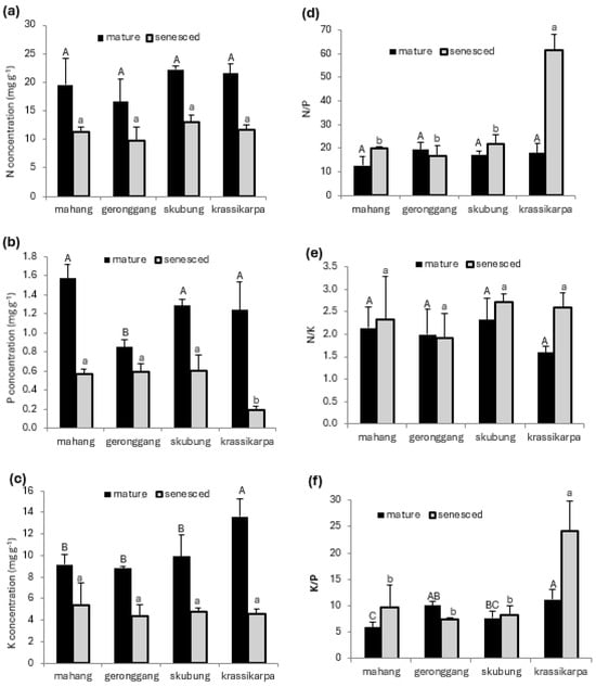 (a) Content of N in mature and senesced leaves. (b) Content of P in mature and senesced leaves. (c) Content of K in mature and senesced leaves. (d) N/P ratios in mature and senesced leaves. (e) N/K ratios in mature and senesced leaves. (f) K/P ratios in mature and senesced leaves. Post hoc comparisons revealed statistically significant differences (p < 0.05) between treatments, as denoted by distinct alphabetical groupings above the columns. Uppercase letters indicate significant differences among mature samples; lowercase letters indicate distinguished senesced treatments.