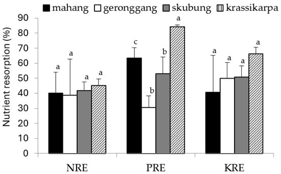 Among native species, nitrogen and potassium resorption efficiencies (NRE and KRE) did not vary significantly, with ranges of 39–42% and 41–51%, respectively, being recorded (Figure 2). In addition, the NRE and KRE values of native species did not vary significantly from those of krassikarpa (NRE = 45%; KRE = 66%). Among native species, the phosphorus resorption efficiency (PRE) was significantly higher in mahang (64%) and skubung (53%) than in geronggang (31%). However, the highest PRE value (84%) was obtained for krassikarpa, which was significantly higher than for any native species.