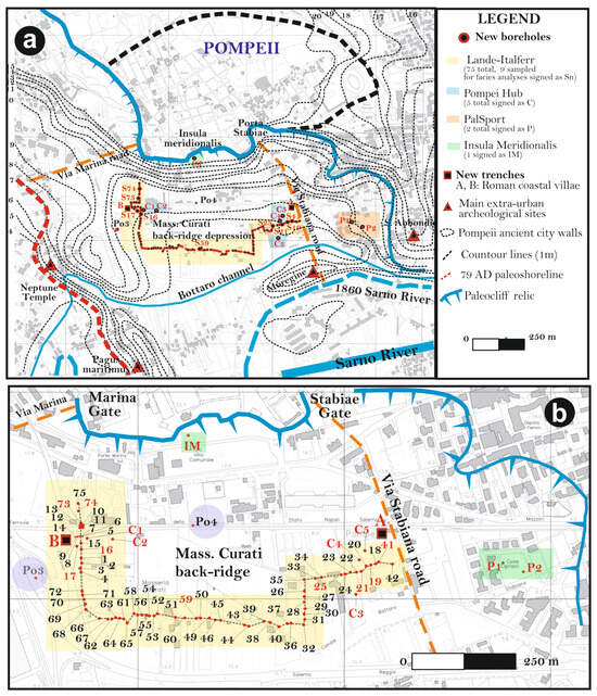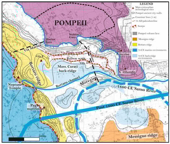 The Roman city of Pompeii is famous for its destruction in 79 CE, when Vesuvius awoke explosively, producing one of the largest eruptions of its history. The city was buried under several metres (4–6 on average) of volcanic products consisting of fall and pyroclastic current deposits [1,2,3]. Buildings were destroyed, and the inhabitants were killed by building collapses or died by asphyxia or thermal impact due to fine particle load and the temperature of pyroclastic currents [4,5,6,7,8,9]. For many centuries, Pompeii slept beneath its layers of ash and pumice, which perfectly preserved the remains. In the 1700s, these were finally partially unearthed, and the world caught a tantalising glimpse of a Roman city “fossilised” in time. The main public buildings discovered included the forum, theatres, temples and amphitheatre, as well as private lavish villas and all kinds of houses, some dating back to the 4th century BCE; however, several suburban structures (including the harbour) are still not identified. It seems certain that Pompeii was first settled by Oscan and Etruscan inhabitants [10], then strategically urbanised and built on a relic of an ancient volcanic hill, close to the Tyrrhenian Sea at the mouth of the Sarno River [11,12,13,14]. The paleogeographic and paleoenvironmental reconstructions of the Sarno alluvial-coastal plain, and in particular of the Pompeii coastal landforms, play a key role in understanding the birth, development, rise, decline and disappearance of this important ancient city and its infrastructure. The choice of location of the settlement was a direct consequence of the coastal and volcanic landforms in the alluvial coastal plain. In particular, the development and rise of the urban layout were related to the proximity of the coastline, while the decline and social crisis were not only related to political and socio-economical factors but also to the alteration of the coastline, volcanic eruptions and volcano-tectonic movements (earthquakes and ground uplift) [12,14,15]. The disappearance of a number of Roman towns in the Vesuvian area was due to them being buried under the pyroclastic deposition by fall and flow processes that acted during the Plinian eruption of 79 CE [16,17,18]. The eruption buried the 79 CE ground surface and landforms with up to 5 m of pumice and ash layers, causing the total destruction of the ancient towns of Pompeii, Stabiae, Oplontis and Hercolaneum [10]. At the same time, the layers of the eruption allowed for the preservation of the 79 CE environments and landforms, especially in the coastal and alluvial plain sectors.