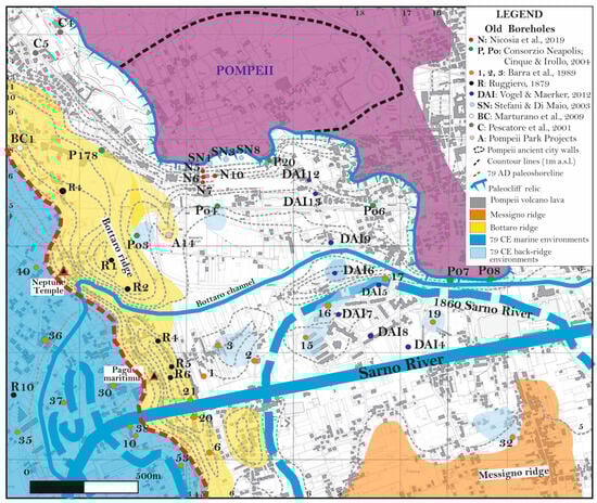 In this area, we analysed archeo-stratigraphical data from the literature [11,19,20,21,22,23,24,25,26,27] and obtained new stratigraphical and paleoenvironmental data from 83 new boreholes and trenches. Better detail of the drilled successions was given to the layers covered by 79 CE deposits, in order to identify ancient environments (e.g., marine, shallow marine, marshy, fluvial, etc.) and their distribution along the Pompeii coastal sector. The layers just below the 79 CE deposits were sampled and analysed in detail for their paleontological contents (ostracoda, foraminifera, etc.). This multidisciplinary approach allows us to distinguish between 79 CE marine, shallow marine, marshy and fluvial environments, as well as paleosols and anthropogenic deposits. Being shallow marine environments localised in the central sector of the morphological depression, named Masseria Curati, very close to the Pompeii city gates (Porta Marina and Porta Stabiae), we used these paleoenvironmental data to hypothesise on the unknown location of the harbour, comparing it with other available data from the literature [25,28,29,30,31,32,33,34,35,36,37,38,39,40].