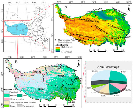 Distribution of elevation (A) and vegetation types (B) on the Qinghai–Tibet Plateau.