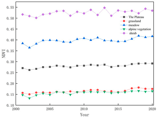 Changes in the growing-season NDVI of various vegetation types on the Qinghai–Tibet Plateau, 2001–2020.