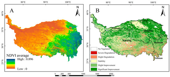 Theil–Sen median trend analysis and Mann–Kendall significance testing were performed in combination to evaluate the multi-year growing-season NDVI values image by image and to further explore the plateau’s spatial pattern of NDVI evolution. The NDVI change trends were categorized into five grades based on the slope and the test statistic Z value. These were severe degradation (S < 0.0005, |Z| ≥ 1.96), slight degradation (S < 0.0005,|Z| ≤ 1.96), stable (−0.0005 ≤ S ≤ 0.000 5, |Z| ≤ 1.96), slight improvement (S ≥ 0.0005, |Z| ≤ 1.96), and significant improvement (S ≥ 0.0005, |Z| ≥ 1.96) [53]. The plateau vegetation largely experienced improvement in the growing season, followed by stability (Figure 3B), with 65.68% and 25.49% of the area dominated by these grades, respectively. Only 8.83% of the area experienced degradation. The areas categorized as having experienced severe degradation, slight degradation, slight improvement, and significant improvement were 0.99%, 7.84%, 29.61%, and 36.07%, respectively, with significant improvement having the largest area of the five categories. The areas experiencing vegetation degradation in the growing season were mainly spread across central Tibet, southeastern Tibet, and the southeastern edge of the plateau, i.e., most of the areas in the bottom of the valley in southern Tibet, as well as in localized areas of Sichuan, Yunnan, and Qinghai. The areas experiencing vegetation cover improvement in the growing season were mainly spread across the western, central, northern, and eastern parts of the plateau, i.e., most of the northern part of the plateau, the Hengduan Mountains, and the Qilian Mountains, with the northern part of the plateau following the most significant upward trend.
