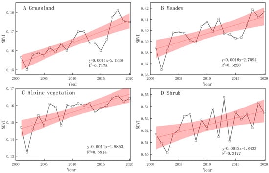 To more deeply interpret the change characteristics of the regional vegetative ecosystems, four major vegetation types were analyzed in detail. The NDVI of the Qinghai–Tibet Plateau trended upward overall during the growing season, with spatiotemporal characteristics differing by vegetation type. In grassland vegetation on the plateau, the NDVI varied within the range of 0.15–0.18 and fluctuated upward, with a linear growth rate of 0.0011/a, a minimum value of 0.150 recorded in 2002, and a maximum value of 0.181 recorded in 2018 (Figure 4A). In meadows (Figure 4B), the NDVI varied within the range of 0.36–0.42 and displayed a clear upward trend, with a linear growth rate of 0.0016/a, the minimum value of 0.364477 recorded in 2002, and the maximum value of 0.41874 recorded in 2018. In alpine vegetation (Figure 4C), the NDVI varied within the range of 0.13–0.17 and followed a significant upward trend, growing at a linear rate of 0.0011/a, and a minimum of 0.132 in 2002 and a maximum of 0.165 in 2018 were recorded. In shrub vegetation (Figure 4D), the NDVI varied within the range of 0.50–0.55 and showed large fluctuations trending upward, with a linear growth rate of 0.0012/a, the highest recorded value of 0.547 in 2013, and the lowest recorded value of 0.501 in 2003. In summary, the NDVI values of the different vegetation types displayed significant hierarchical differences, with shrubs having the highest NDVI values, followed by meadows, then grassland, and finally alpine vegetation with the lowest NDVI values.