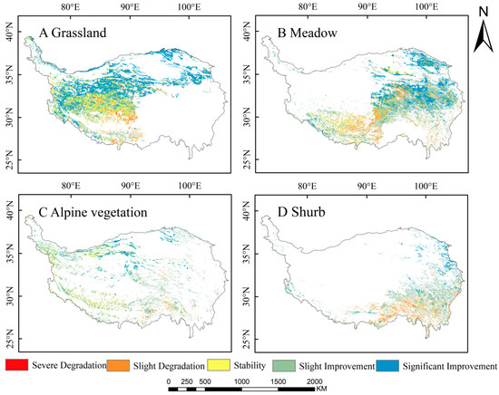 - The NDVI change trends vary among various vegetation types. Of the four major vegetation types analyzed here, meadows have the largest area of improvement, grasslands have the largest area of stable land, and shrubs have the largest area of degradation.