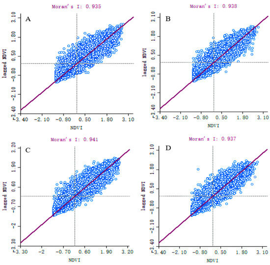 Moran scatterplot of global NDVI spatial autocorrelation on the Qinghai–Tibet Plateau during the growing season. Note: (A) (2005), (B) (2010), (C) (2015), and (D) (2020).