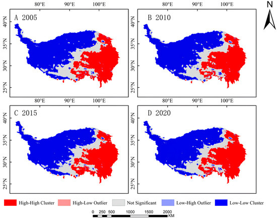 Spatial autocorrelation testing was carried out during the 2001–2020 growing seasons on the Qinghai–Tibet Plateau. Four representative years were chosen for the global spatial autocorrelation analysis: 2005, 2010, 2015, and 2020. First, the mean NDVI of the four years was calculated by using the fishing net tool in ArcGIS 10.7, and then, the spatial data were imported into GeoDa software 1.21, and the spatial weight matrix was created to define the adjacency relationship. Next, the global Moran’s I was calculated by the Univariate Moran’s I tool to evaluate the spatial autocorrelation and its statistical significance. For many years, the global Moran’s I of the NDVI on the plateau was greater than 0.935 (Figure 6), had a high Z-score, and passed the significance test, thus demonstrating a significant positive spatial autocorrelation (p < 0.01). This indicated that the plateau’s vegetation cover was in a highly aggregated state during the growing season. The degree of spatial agglomeration of the NDVI in the plateau’s growing season showed an initially increasing trend that later declined. In contrast, from 2000 to 2015, Moran’s I gradually increased. The vegetation cover was most spatially correlated in 2015, with a Moran’s I of 0.941 (Z = 302.55, p < 0.01), and then, it slightly decreased to 0.937 (Z = 298.99, p < 0.01) in 2020. The distribution of the random points was highly similar in the four years, and they were mainly found in quadrants 1 and 3, with a smaller portion in quadrants 2 and 4. The spatial distribution of the multi-year growing-season NDVI had a strong positive correlation and agglomeration effect.