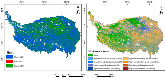 - Hurst index calculation and future trend analysis were carried out for the NDVI during the growing season to better understand the characteristics of future vegetation trends. It is helpful to scientifically predict and evaluate the long-term trend of vegetation change and provide theoretical support for the formulation of effective ecological protection and restoration strategies so as to reduce the risk of vegetation degradation and protect the fragile ecological environment of the Qinghai–Tibet Plateau. The average Hurst index value was 0.46, which indicates that the current trends of the growing-season NDVI of the plateau are unlikely to continue in the future. This agrees with the findings of Chen et al. [62]. The vegetation around the Tarim Basin will show an upward trend in the future, thanks to the warming and humidification of the climate and the implementation of a series of ecological protection measures, such as returning farmland to forests and ecological water delivery [63]. In addition, it is expected that the areas degraded in the future will be mainly distributed in the eastern part of the plateau, especially in humid and semi-humid areas, such as Sichuan, Yunnan, and eastern Tibet. These regions, with their warm and humid climates and large populations, are likely to experience degradation of vegetation cover during the growing season as a result of increased human activity [64]. In addition to human activities, soil erosion [65] and geological disasters are also important factors affecting vegetation changes in these areas. As a result, it will be necessary to closely monitor the region’s vegetation cover and to implement several regulations to protect the plateau’s ecosystem in the years to come.