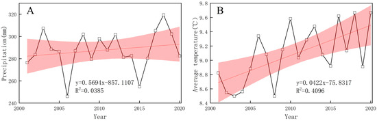 Interannual variation diagram of precipitation (A) and average temperature (B) in the 2001–2020 growing seasons on the Qinghai–Tibet Plateau.