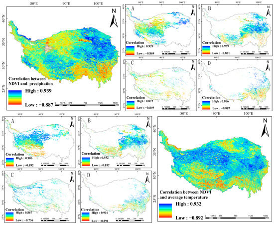 Correlation of the NDVIs of the main vegetation types with precipitation and average temperature during the 2001–2020 growing seasons on the Qinghai–Tibet Plateau: (A) grassland, (B) meadow, (C) alpine, and (D) shrub).