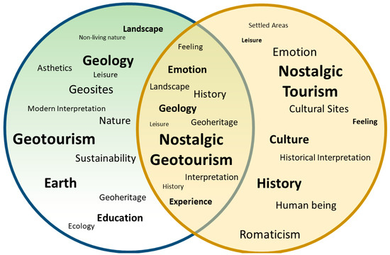 Nostalgic geotourism represents a tourism approach that explores geology through a nostalgic presentation of historical facts. Nostalgic geotourism focuses on historical descriptions of the landscape, highlighting topographic details and explaining the processes that shaped the landforms. It incorporates early geological and geomorphological concepts, even though these are outdated compared to modern knowledge. This approach views and describes the landscape holistically, considering all its components. Figure 2 illustrates the connection between nostalgic tourism and geotourism through a word cloud format, which effectively highlights the key concepts associated with each research area. This visualization method was selected for its clarity and impact. By mapping the concepts from both domains, the figure aims to demonstrate the overlap and commonalities between these two types of tourism. It also identifies shared characteristics that underpin the emerging field of nostalgic geotourism, providing a conceptual framework for understanding this novel tourism approach.