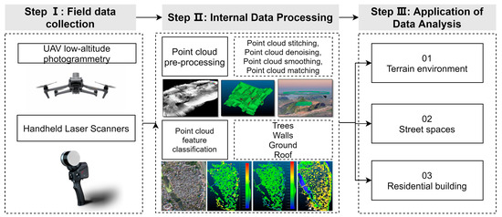 This study constructs a technical route for the quantification and analysis of spatial characteristics in traditional villages, which includes three parts (Figure 2): field data collection, data processing, and data analysis and application. In the field data collection stage, low-altitude UAV aerial photography and handheld laser scanners are used to obtain 3D point cloud data. Afterwards, the point cloud data is processed, including denoising, fusion, and object classification. Finally, data analysis and application are conducted based on quantifiable indicators of village spatial characteristics. The following sections will focus on the technical characteristics of each step and explain the data acquisition methods and analysis techniques.