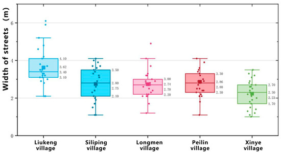 Figure 10 shows the relationship between distance and the number of point clouds for each street in Liukeng Village. By comparing multiple charts side by side, the following patterns of street scale can be observed: (1) Street widths in Liukeng Village range from 2 to 6 m, as indicated by the significant number of point clouds within this range. (2) Compared to typical villages in Zhejiang and other areas, the average street width in Liukeng Village is slightly larger, at 3.62 m. Figure 10 presents box plots of street width values for four villages, including Shiliping Village, Longmen Village, Peilin Village, and Xinye Village, in Zhejiang, compared to Liukeng Village. From Figure 11, it can be seen that the median and mean street widths in Liukeng Village are larger than those in the other villages. The digital results, compared to previous textual summaries, provide a more intuitive and accurate reflection of the width variation and spatial distribution of the streets in Liukeng Village, quantifying the spatial characteristics of street spaces in traditional villages.
