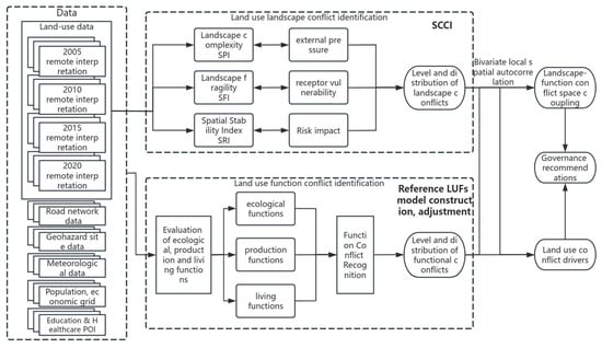 In general sociological research, “conflict” refers to the incompatibility or antagonism among different actors regarding their goals, leading to psychological and behavioral contradictions [17]. As academics increasingly focus on land resources and ecological environments, this theory has been gradually integrated into ecological conservation and land resource utilization studies [18,19], introducing the concept of land conflict, often described as “land use conflict” [20,21,22,23]. This study adopts the following definition of land-use conflict in economic geography: the phenomenon of spatial competition and conflict of interest between people and land caused by the land-use patterns and structures of stakeholders in the land-use process [24]. It is widely recognized in academia that land-use conflict arises from the mismatch between the limited nature of land resources and the purpose of the land-use subject. It is essentially a conflict of interest between people and land, people and people. The identification and mediation of land-use conflict is of great significance to maintain the sustainable development of land use. Currently, the most essential research on land-use conflicts in academia focuses on the identification of conflicts: scholars such as Greg Brown used participatory mapping to identify land-use conflicts [25]; Iwona Cieślak used multi-criteria decision making to identify land-use conflicts [26]; Yuan Gao and other scholars based their research on the functional context of production-ecology-life and used a multi-indicator model to identify land-use conflicts in mining cities [27]. In addition, some scholars have also conducted systematic research and discussion on the analysis of influencing factors and evaluation system construction of land-use conflicts [28,29], conflict evolution processes, and conflict governance [30,31,32]. The mainstream approach to the identification of land-use conflicts in current academia is multifactor superposition analysis. Usually, the grid or village or township-level administrative area is used as the unit, and the scores of each factor are weighted to identify the land-use situation, and then the type and intensity of conflicts in each land unit are identified by constructing a discriminant matrix. In previous studies, the evaluation system is also usually constructed with the combination of contributions from different land functions, differentiated spatial combinations of land landscapes, and the interest orientation of land-use subjects as elements. As a result, different themes have been formed around land-use conflicts, such as conflicts of land-use functions, conflicts of land-use landscapes, and conflicts of land-use rights. The research on land function conflicts focuses more on the multifunctionality of land; the research on land-use landscape conflicts focuses more on the natural attributes of land; and the research related to land tenure conflicts focuses on the social attributes of land. With the development of the concept of sustainable development, combining the multifunctionality and natural attributes of land from a quantitative perspective has gradually become an important issue.