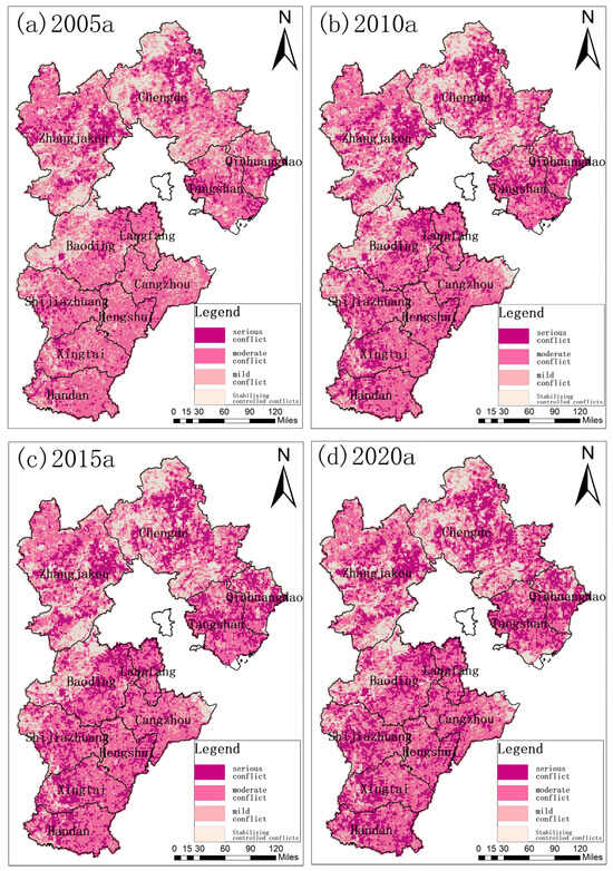 Changes in landscape conflict in Hebei Province, 2005–2020. (The four colors from top to bottom correspond to “Stabilizing controlled, Mild conflict, Moderate conflict, Serious conflict”.)
