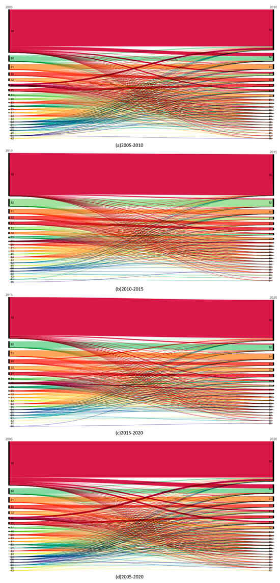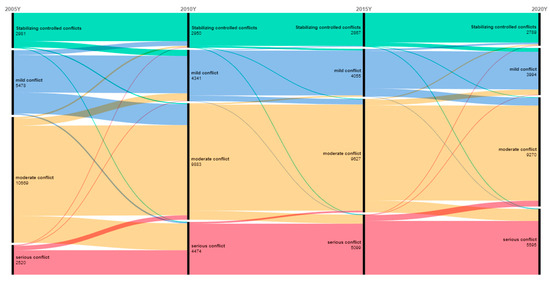 Overall, from 2005 to 2020, Hebei Province’s landscape conflict types changed quantitatively, with stable and controllable units generally remaining stable. The number of severe conflict units rose sharply, transforming mild and moderate conflict units into severe ones in turn, showing a significant evolutionary trend (Figure 4). Notably, as conflict units transitioned to severe, some stable, controllable, and mild conflict units directly shifted to severe conflict.
