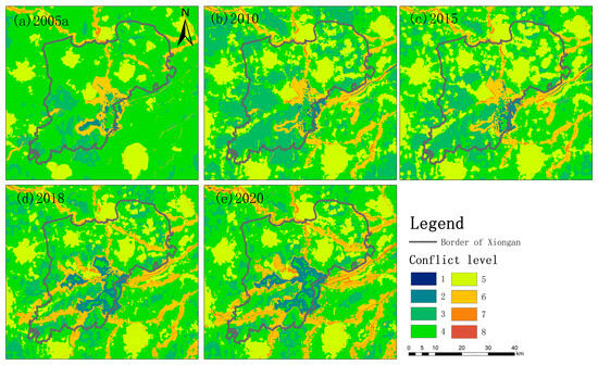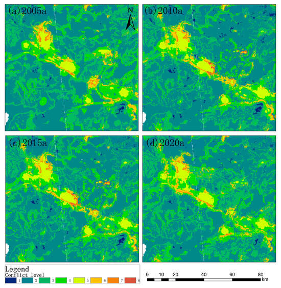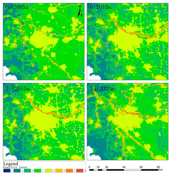 Within the Beijing–Tianjin–Hebei regional integration strategy, Hebei Province assumes critical roles in industry transfer from Beijing and Tianjin, as well as in maintaining regional ecological barriers [51]. This strategic positioning generates differentiated land resource allocations, shaping conflict fluctuations amid regional synergistic development. For instance, Xiong’an New Area, a satellite city of Beijing established in Hebei, began construction in 2017 across a 1770 sq. km area. Notably, during 2005–2015, conflicts within Xiong’an remained at lower levels (Figure 10a–c). However, during 2015–2020, conflicts escalated, particularly around urban areas, and even reached grade 7–8 in some cases (Figure 10c,d). The development and construction of new districts encroached on arable lands, while delays in demolishing and renewing extensive old towns exacerbated functional conflicting land use.