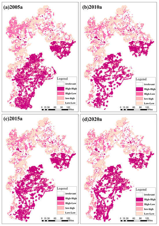 The study area exhibits heterogeneity in spatial distribution among the four types of aggregation (Table 10 and Figure 9):