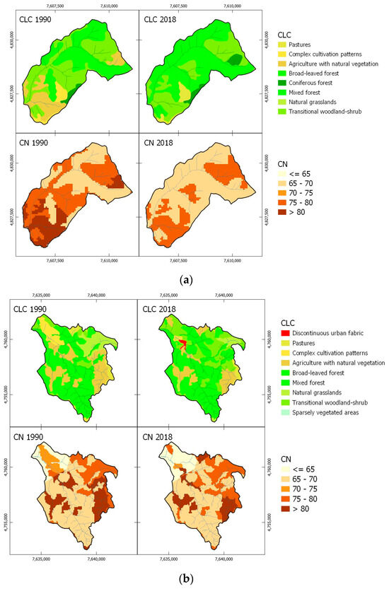 Changes in CLC from 1990 to 2018, along with the corresponding curve number (CN) values for the watersheds of Sinja River in Eastern (a) and Poganovska River in Southeastern Serbia (b).