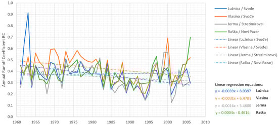 The annual runoff coefficient—RC, defined as the ratio of annual runoff to precipitation, was used as a metric to characterise changes in average annual runoff in Southeastern Serbia. The data on annual precipitation and runoff were obtained primarily from the Hydrometeorological data annex of the Water Resources Assessment of Serbia [60]. The mean annual change in RC is expressed as the linear regression coefficient of annual RCs for the available period 1961–2006.