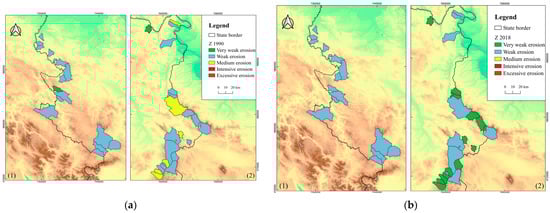 Since the intense soil erosion accompanies the process of the generation of rapid surface runoff, we analysed the changes in soil erosion from 1990 to 2018. Most of the current knowledge on the spatial distribution of soil erosion and its temporal trends in Serbia is obtained through the EPM approach [64]. This enables not only the comparison of results from different spatial units [79,80,81] but also the continuous monitoring and comparison of the state of soil erosion over time within the same spatial units [82,83,84,85]. Average annual gross soil erosion (W—m3/yr) can be calculated as