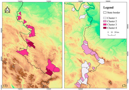 - The next step involved the use of cluster analysis to differentiate the watersheds spatially based on four selected variables: CN change, Index Z, Index RP, and Index AgL). Cluster analysis (CA) is a multivariate statistical analysis method commonly used for management strategies in small catchment areas [90]. An agglomerative hierarchical method was applied, where each watershed initially stands alone as its group. The method aims to group different objects (watersheds). The method aims to maximize the similarity between watersheds within the same group [91]. As a result, watershed groups exhibit a high degree of internal (within-group) homogeneity and external (across-group) heterogeneity [92]. A hierarchical tree (dendrogram) visually represents these spatial similarities, showing the clusters determined by the analysis. The Ward method of hierarchical clustering with square Euclidean distance was employed [90].