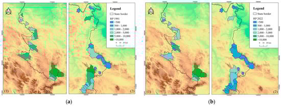 The indices are classified according to the following scale: high index < 10, medium–high index = 10–30, medium index = 30–50, medium–low index = 50–70, low index > 70–100, and growth index > 100. The parameters as indicators of rural population changes were defined for the period from 1991 to 2022 and agriculture land use from 1991 to 2012 [89]. The demographic and agricultural data sets from 374 rural settlements were processed. Data on the rural population were used from the Statistical Yearbooks for 1961–2022 of the Republic Institute of Statistics (2022) [89]. Agricultural data were used from the Census of Agriculture for 1991 and 2011 of the Yearbooks of the Statistical Office of the Republic of Serbia (2012) [89].