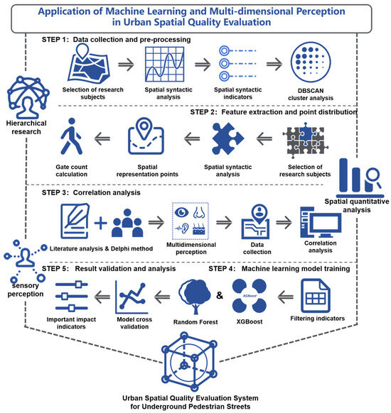 This study aims to develop a comprehensive evaluation model for the spatial quality of underground pedestrian streets using a multilevel and multidimensional approach. The research methodology integrates Quantitative Spatial Analyses, Multidimensional Sensory Perception, and Machine Learning Algorithms, ensuring that the objectives of each stage are closely aligned with the method, thereby enhancing the scientific rigour and applicability of the model. The research framework is structured into three phases.