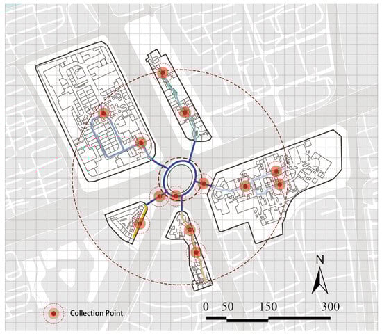 From a humane perspective regarding the scope of this study on walking as a mode of transportation, people give up driving and choose to walk a distance of 400 m or 5 min to reach the destination of the distance [58]. The Pongprasert P study indicates that respondents are more receptive to the walking experience when the distance is approximately 500 m [59]. Considering the actual conditions of street coverage and the functional distribution at the specific site of the respondents in this study, the analysis focuses on underground pedestrian spaces within a 250 m radius from the centre of the block where the underground pedestrian street is located. These spaces include underground public pedestrian streets, underground commercial pedestrian streets, and sunken plazas, as shown in Figure 3.